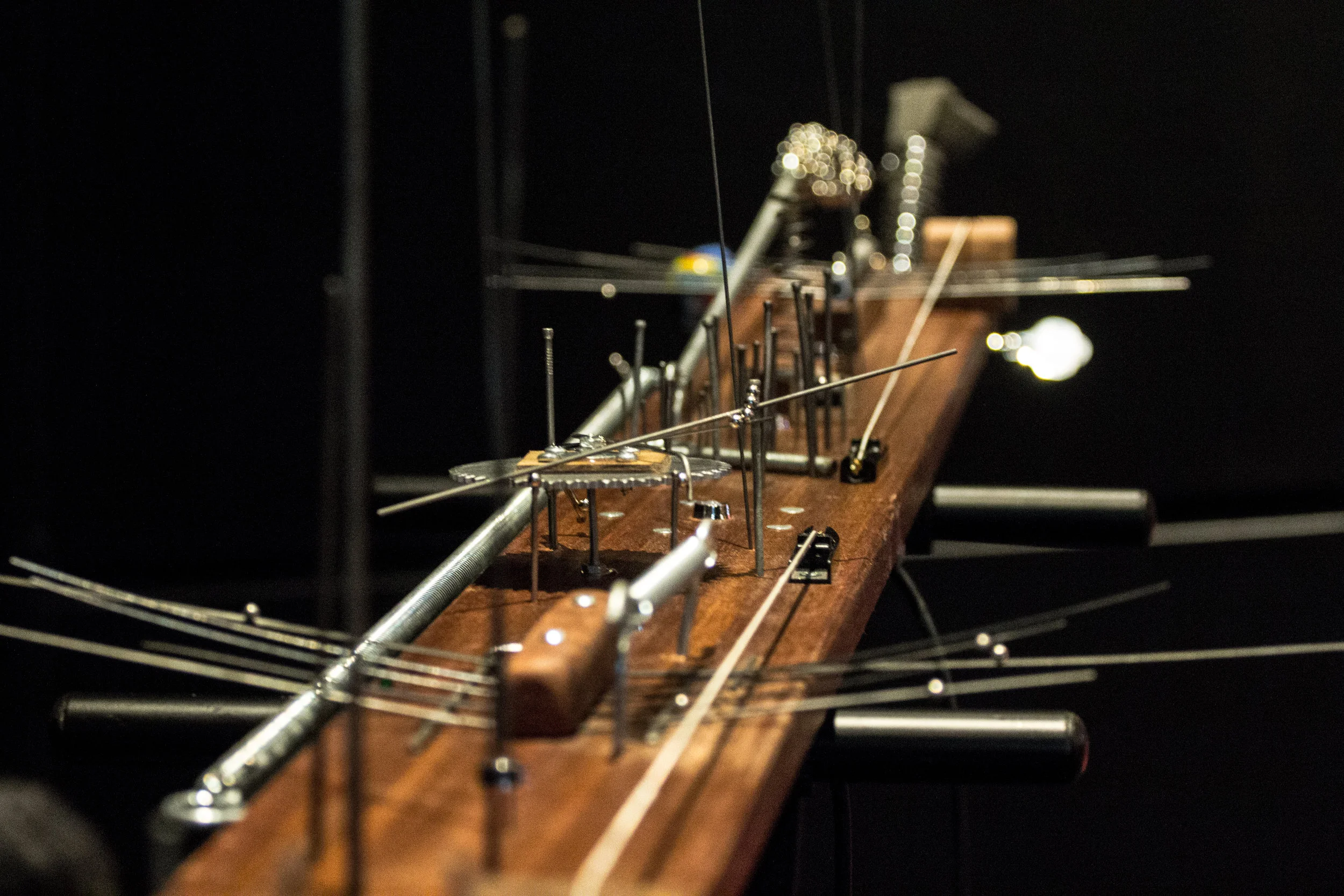 An onboard micro-controller controls six lights installed on top. Players take turns by touching one of 5 capacitive nails which randomly change both the lights and audio processing parameters. The TM can be calibrated to have more or less autonomy and authority in the system. Long feedback delays give the system slowly fading memories, taking sounds from contact microphones and repeating them at long intervals. Over time the delay times begin to shift, modulating the delay lines in unpredictable ways.
